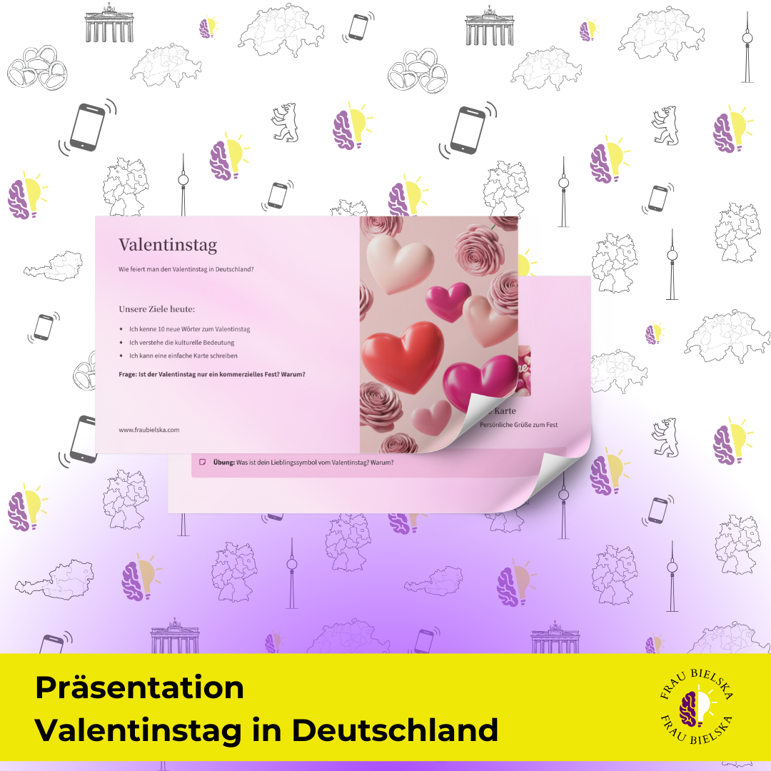 Nauka języka obcego jest najskuteczniejsza wtedy, gdy łączy emocje, aktywność i realny kontekst kulturowy. Prezentacja „Valentinstag in Deutschland” to kompletny, gotowy do użycia materiał lekcyjny, który wprowadza słownictwo i elementy kultury DACH w sposób angażujący i zgodny z zasadami neurodydaktyki.